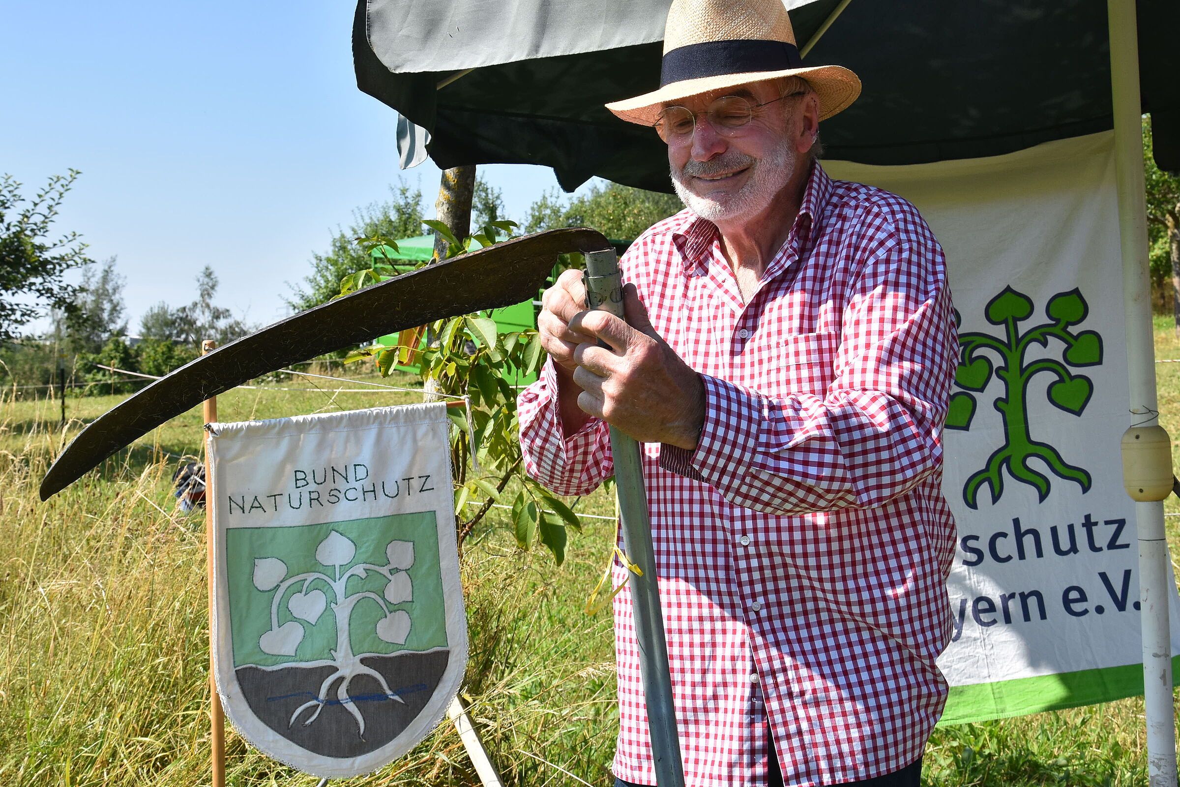 Beim eigentlichen Mähen der Blumenwiese sollte verdeutlicht werden, wie eine schwungvolle Bewegung die gesamte Wirbelsäule mobilisiert, die Rückenmuskulatur und damit die Beweglichkeit fördert, als Voraussetzung für körperliches Wohlbefinden. Direkte Naturverbundenheit, der Geruch des Grases, Blumenduft und Tau, können die psychische Ausgeglichenheit fördern und der meditative Charakter der Tätigkeit ermögliche den Abbau von Stress, meinte Franz Gumplinger als Vorsitzender der Bund Naturschutz Ortsgruppe abschließend. „Die Artenvielfalt wird im Vergleich zum Rasenmäher wesentlich besser erhalten und nicht zuletzt ist es einfach schön, auf diese Weise die alten Handwerkskünste ein wenig am Leben zu erhalten“.