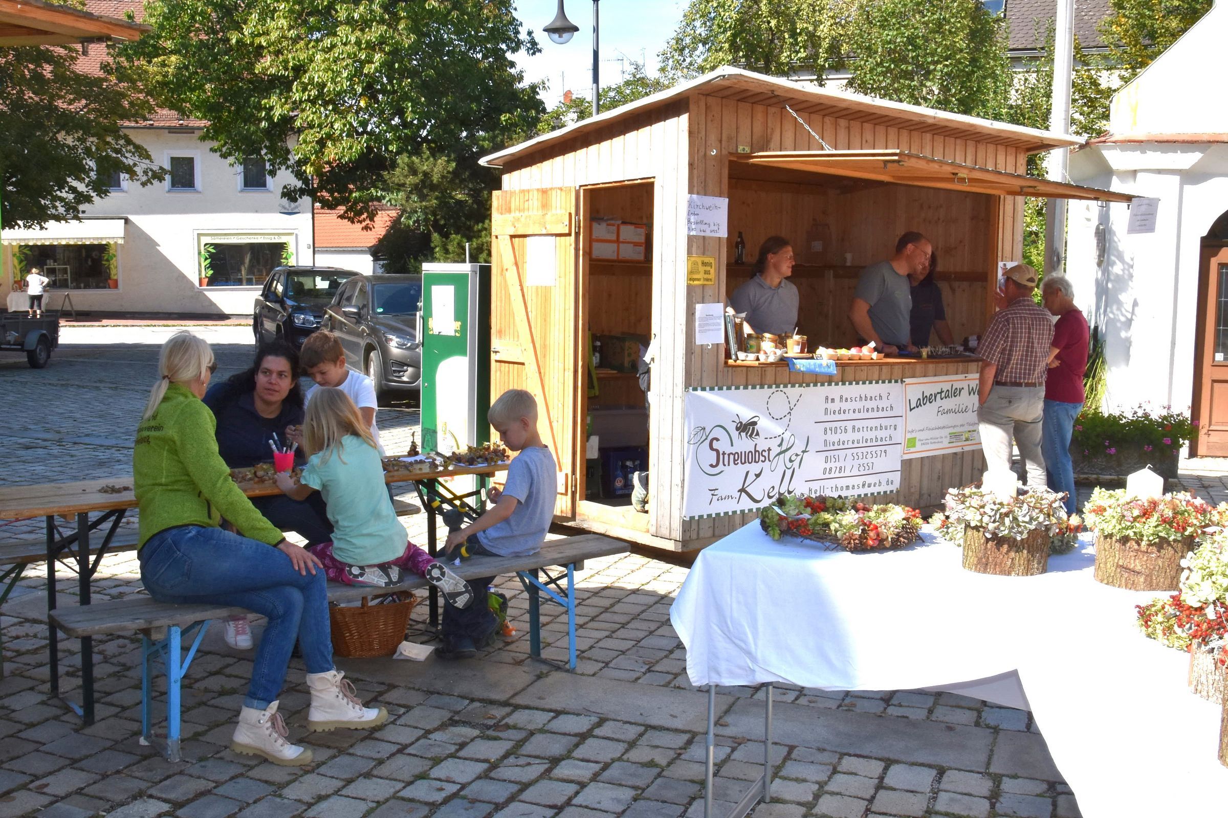 Um 11.30 Uhr eröffnet Bürgermeister Alfred Holzner den Umwelt-Markt für die Besucher, mit vielfältigen Anziehungspunkten, Infoständen und Marktbuden. Hier werden regionale Produkte verkauft vom Streuobsthof Kell Niedereulenbach und „Laabertaler Weiderind“ der Familie Josef Lang. Der Gartenbauverein bietet herbstliche Kränze. Mit der Umweltreferentin Veronika Obepriller können Kinder Insektenhotels aus Naturmaterialien basteln.