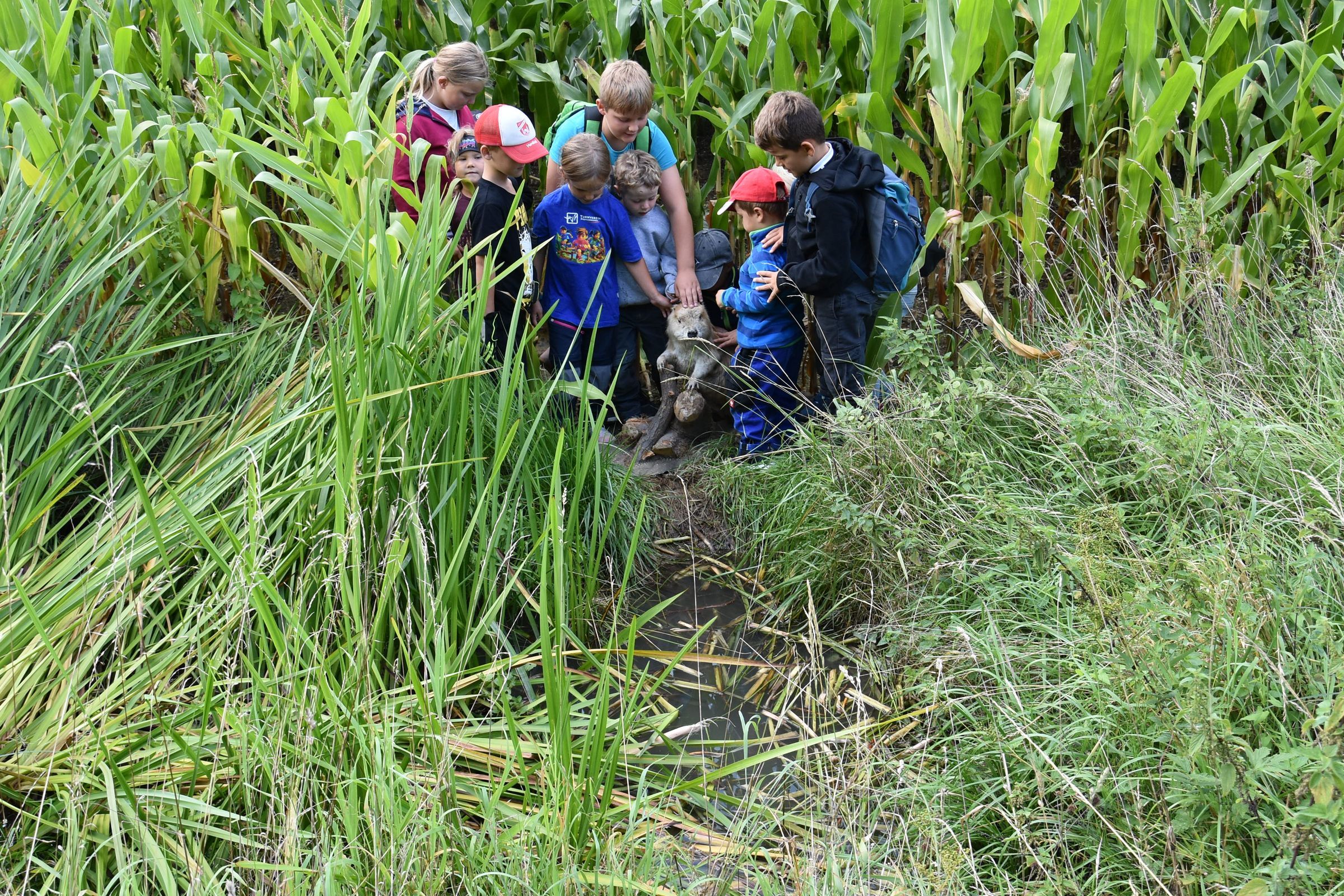 Ein Ziel der Ferienwanderung war Ferienwanderung war: "Achtsames Erforschen der Tier- und Pflanzengesellschaften, besonders im Bereich der Hangquellbereich des Otterbach“. Mädchen und Buben schlüpften durchs Gestrüpp. Sie durften klettern, über wild durcheinander liegende, mächtige Baumleichen. Biber haben hier über mehrere Jahre die Talaue umgestaltet in Lebensräume, für selten gewordene Tier- und Pflanzengesellschaften. Von den Kindern Immer wieder bestaunt, wurden geheimnisvolle Insektenteile, ein kleiner Frosch, tierische und pflanzliche Fundstücke im dichten Gestrüpp.