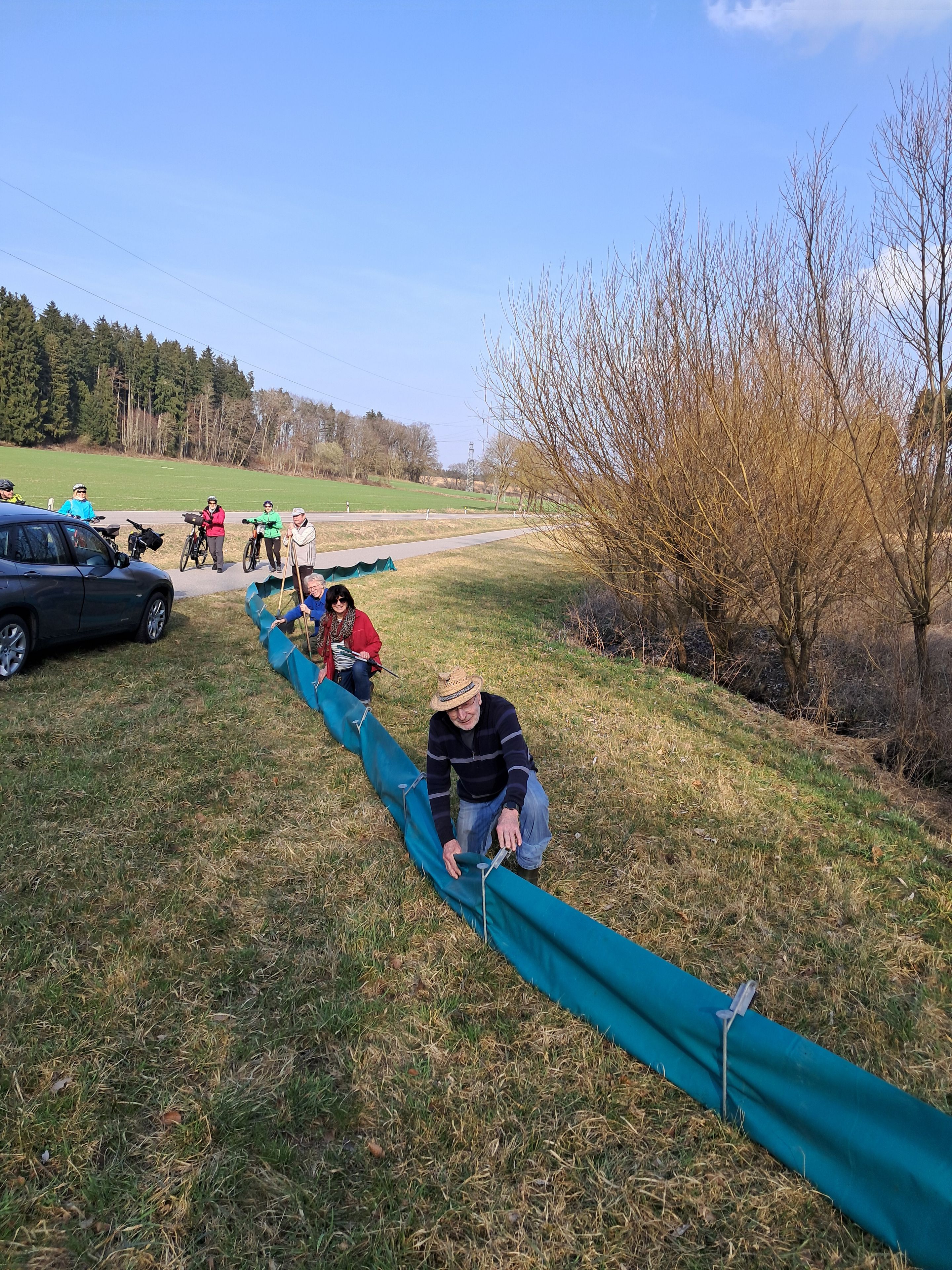 Deshalb stellten freiwillige Helfer des Bund Naturschutz in Bayern (BUND) , so wie hier die BN-Ortsgruppe Rottenburg an der Staatsstraße zwischen Rottenburg und Neufahrn, eine flexible Amphibienschutzfolie auf. Die blauen Wanderbarrieren entlang des Baches, sind als Ergänzung zu der bereits länger vorhandenen Leiteinrichtung aus Metall, gedacht. Mehrere, aufeinander abgestimmte Schutzmaßnahmen sollen, mit dem großen Durchlassrohr unter die Staatstrasse hindurch, ihren Zweck so gut wie möglich erfüllen.